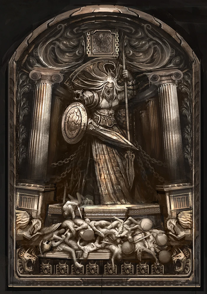 En el Palacio de los Hados, hay una cámara en donde hay estatuas de los Dioses y ahí está la estatua de Ares y en la descripción dice: Ares, el caído dios de la guerra.