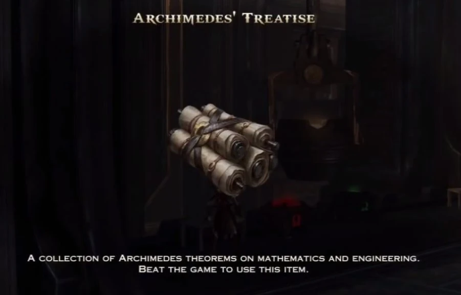 The artifact is located in the area that you discover Archimedes' body, the Furnacle. It is located in the bottom left hand side of the screen by the blue and green orb chests. They are various documents made by Archimedes.