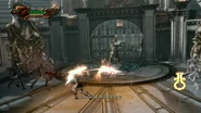 Kratos used the walls that were overgrown with spiked vines to defeat Hercules in order to retrieve the Nemean Cestus. After Kratos removed the Cestus from Hercules' hands, Hercules continued to attack him with his bare hands by grabbing, punching and throwing the statues around the Arena at him.