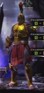 The Champion's Armour sports a gold breastplate, helmet, shin guards, and arm guard as well as a red kilt that is similar in style to Kratos'. The helmet has a large red and black plume arching over it and the warrior's face is completely covered. The entirety of the armor is similar in appearance to that of a legionnaire.