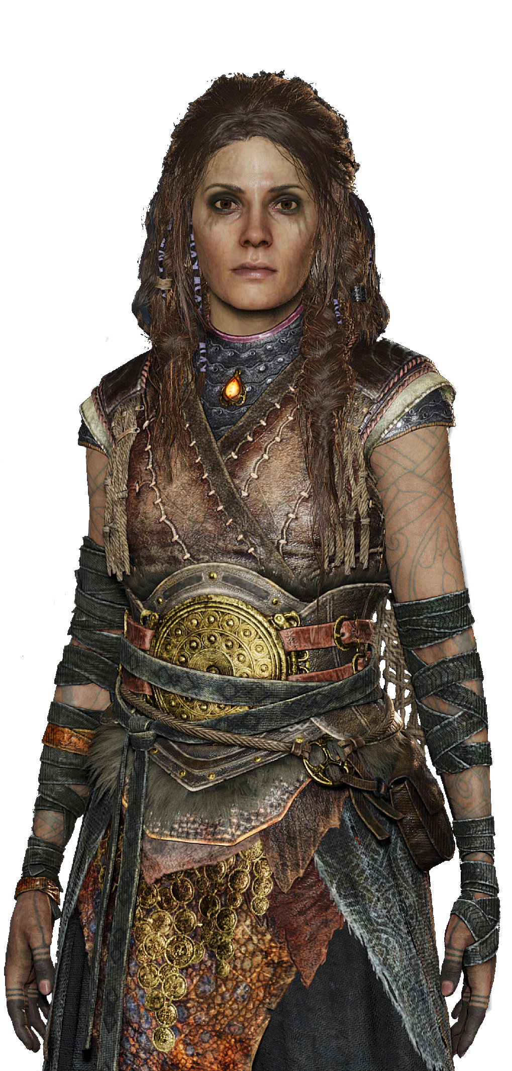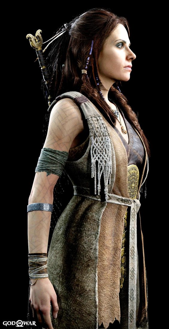 When she was first met by Kratos and Atreus, she wears a light brown dress with animal skins and has faded tattoos on her arms, Freya wears a simple beaded necklace that holds great personal importance for Freya—a gift from her young son in better days, she also wears her Brísingamen, it is more than just a beautiful amber amulet; it contains the name of her son embedded within. The Golden Waistguard of Duty is a remnant from a solemn responsibility Freya once took very seriously. The Silver Band of Remembrance on her left arm is a piece of jewelry that harkens back to her time before being the Witch of the Woods. Much like her necklace, this simple beaded bracelet on her right arm was a gift from her son—a reminder of a happier time long past. Freya's crocheted woolen cape is intricately made and inspired by grand tapestries from her home realm. Towards the end of their journey, she is seen wearing a much more regal outfit; a dark brown leather dress with intricate runic patterns and gold inlaid into the lower part of dress. She also wears a bright orange shirt and her tattoos are no longer faded. Freya is seen exclusively barefoot. She is quite tall, even standing taller than her son, Freya is tall enough that she can see Kratos eye to eye. According to Mimir, her fertile beauty was one of the reasons Odin agreed to marry Freya.