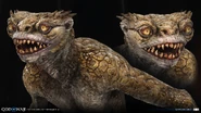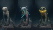 Grims are short heighted amphibian creatures with the variety colors are brown, blue, violet, and yellowish skin. It also has sharped claws, narrowed head with bearded, flak-looking sharp teeth, and wickedly eyes. They are some varieties of Grims are Cursed Grim and Wicked Grim.
