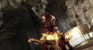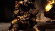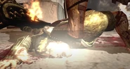 The Gods quickly took action to defeat the Titans once again. Helios jumped onto his Sun Chariot and began attacking Gaia, throwing a fireball, combusting a fallen tree to prevent Kratos from escaping the undead soldiers that swarmed the Titaness' shoulder. Afterwards, Helios was also seen battling the Titan of Destruction, Perses, and successfully dislodged him off the mountain.