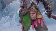 An illusion of Helios, still a disembodied head but very much lucid, appears in in God of War Ragnarök: Valhalla. While in Valhalla, Mimir was teleported to a "forest" while the disembodied head of the Sun God took his place. Compared to the compassionate Mimir, Helios constantly mocks Kratos, confronting him over his past actions. Kratos forces Helios instead to assist him in combat as Mimir did. While in an illusionary version of the Chamber of Sacrifice in Pandora's Temple, Kratos locks him in a cage, much to Helios' dismay, as Kratos, remembering well from his past, has to make a sacrifice in order to access the next area. After fighting countless hordes of Undead Legionnaires, Kratos brings Helios to the fire mechanism that was used for the sacrifice but when he hesitated to do so, Helios was replaced by Mimir in the cage.