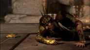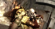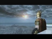 Helios takes Mimir's place again when Kratos to a pocket memory of the Olympian arena. Upon returning to the Chamber of Sacrifice, instead of placing Helios in the cage from earlier, Kratos instead places himself in the cage and offers himself as the sacrifice. Upon this, Kratos was teleported to another pocket area and Helios is replaced by Mimir again. Later, in the Helheim Sanctuary, Helios once again replaces Mimir. Returning to the pocket version of the Olympian arena, Kratos uses the ascending sands and returns to Týr with Mimir returning. At a big bowl of water, when a broken and damaged version of Helios' Shield was magically lowered into the water, an image of Helios' brutal death is shown. When Mimir notes to Kratos that his technique has improved immeasurably, the Spartan notes that he needed the Sun God's power to secure vengeance against the Gods of Olympus. Helios' voice bitterly tells him that not tearing his head off was an option and reminds Kratos that depriving Greece of the sun caused perpetual cold and darkness. Crops could not grow again, and Greece was ravaged by famine, angrily telling Kratos that he didn't care.