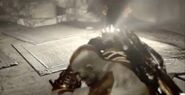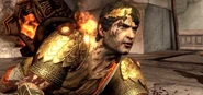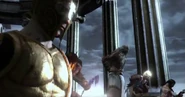 After traveling through the ruined city, Kratos discovers Helios once again; severely injured from being both crushed in Perses' hand and thrown into the city, rendering him unable to lift himself off the ground. A battalion of Olympus Sentinels converged on the wounded Helios, forming a shield that Kratos could not damage due to their Onyx shields. Kratos managed to break their shields by taking control of a Cyclops which had also arrived to assist Helios, using its club to batter through their defenses before ripping the Cyclops' eye socket out and killing it.