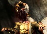 Failing to convince Kratos, and with a final gaze of defiance at the Spartan, Helios sternly told Kratos his death would not lead him to Zeus, only for Kratos to reply that is where he was wrong. Kratos then grabbed his head, and started to pull it fiercely, Kratos then, delivered a powerful hit on Helios' neck, breaking it, and then grabbed the God of the Sun's head again and started to pull it with all his might, Helios screamed in pain as Kratos brutally tore off his head, killing him. Helios' severed head screamed in pain and anger as Kratos observed it. With the God of the Sun's death, clouds blocked the sun, bringing darkness and storms across Greece.