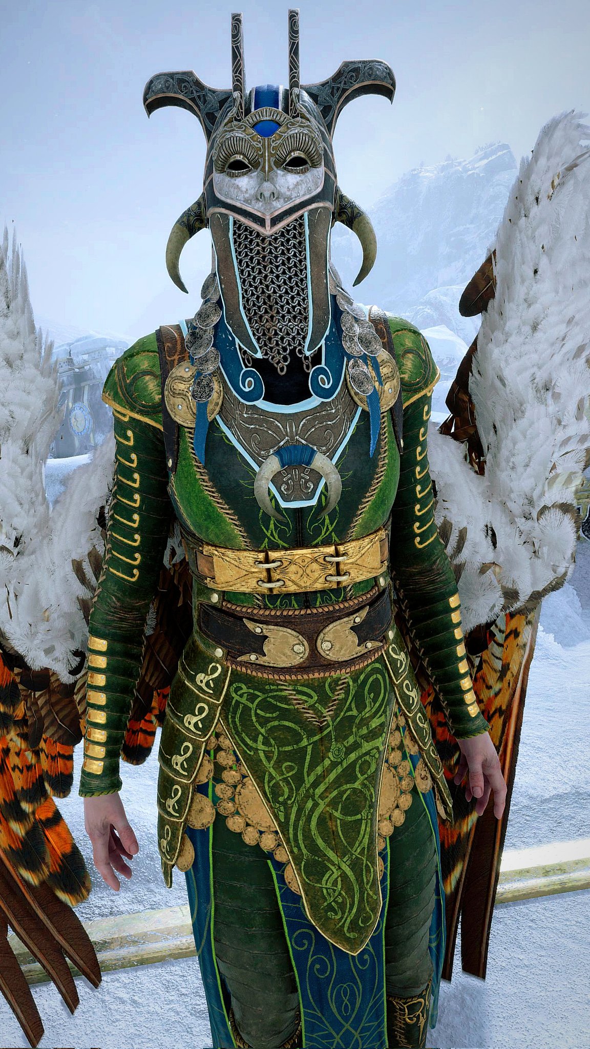 Like all Valkyries, Hildr's face is never shown and each Valkyrie would wear a very different type of helmet, the helmets would be themed together based upon a different creature. Hildr wears a golden helmet inspired by a Boar, these masks are extenuate in all different directions, from various color choices to metalwork designs. The masks emitted regal beauty, while still being creepy in nature. Due to her corruption, her skin is an unhealthy pale blue. But one of the most striking elements of the Valkyries came in the design of their wings. Like the other Valkyries Hildr had extremely large mechanical wings, Hildr's wings were blue, they are covered in golden metal plates as armor thus why they are mechanical in the first place. Like her sisters, her design showed her both skilled and refined. With each Valkyrie, hints of their past would be shown off in their armor sets – not looking completely polished and showcasing a long-and-tired past, such as in the torn feather designs on the helmets.