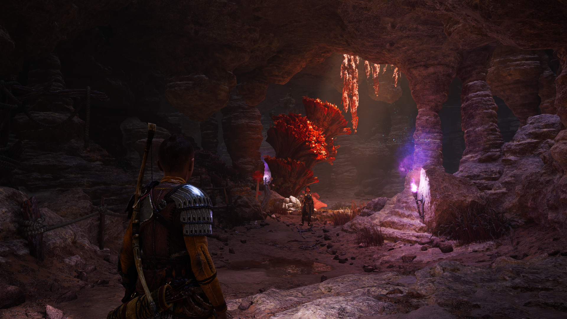 This Legendary Chest is found within Idi's Sinkhole. While it's visible early on, it requires the absolute longest path in the cave to reach. To begin, after you get to the bottom of the sinkhole, you'll slip under a gap into a cave system. Ahead will be a large red plant bathed in sunlight. This is the starting point. First, look for a torch you can tell Angrbroda to light. Do so, then climb up the ledge to the left of the torch. Up the ledge is a split with a table in the middle: take the right-hand path towards a Draugr (passing under a wooden bridge above), then light the torch at the end corner. To the right of the torch is a ledge: climb up it. Up ahead will be a rock column on your right: light the torch on it, then head right and vault over the fallen rock column. Light the torch ahead. At this torch, head right and cross over the bridge (this is the one you passed under earlier). Light the torch on the other side, then continue and jump over the gap in the next wooden bridge. On the other side, light the torch on your left on the rock. Continue forwards and around the corner. At the intersection at the far end, light the torch on your left. Turn left at the intersection to find the last torch to light. That torch will be overlooking a ledge: drop down it, and the chest will be on your right.