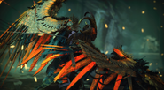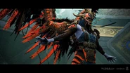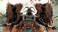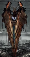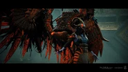 Kara is imprisoned under the Witch's House. Like all Valkyries, Kara's face is never shown and each Valkyrie would wear a very different type of helmet, the helmets would be themed together based upon a different creature. Kara wears a golden helmet inspired by a Ram, these masks are extenuate in all different directions, from various color choices to metalwork designs. The masks emitted regal beauty, while still being creepy in nature. Due to her corruption, her skin is an unhealthy pale blue. But one of the most striking elements of the Valkyries came in the design of their wings. Like the other Valkyries Kara had extremely large mechanical wings, Kara's wings were blueish grey, they are covered in golden metal plates as armor thus why they are mechanical in the first place. Like her sisters, her design showed her both skilled and refined. With each Valkyrie, hints of their past would be shown off in their armor sets – not looking completely polished and showcasing a long-and-tired past, such as in the torn feather designs on the helmets.