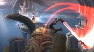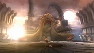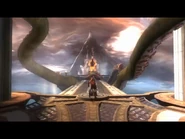 Kratos used the body of his former comrade to aid him with a pressure platform, activating a vent that he used to attack the Kraken's face with the help of Icarus Wings. Enough damage made the beast slam her spiked tentacle into the wall or floor, allowing Kratos to climb up and cut the tentacles from the Kraken's body. After losing two tentacles, she vengefully grabs up the Last Spartan's body and eats it.