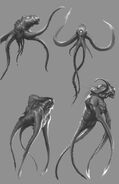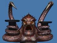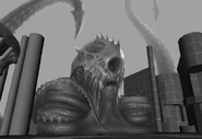 While depicted mainly as a giant octopus-like creature, in God of War II, the Kraken is a ferocious beast with several tentacles and a vicious appetite. Notably, she only displays four tentacles, two used to support her body by curling around the pillars in the area and two used for battle, which are equipped with a heavy spiked black armor-like exoskeleton. Her head has two large eyes, a massive, fanged mouth, and small spines or gills along its sides. She also has oozing sores on her forehead and two main tentacles, holding on to two giant pillars.