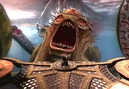 The Kraken appears after Kratos battles and kills the Last Spartan, attacking Kratos by slamming at him with her giant tentacles and by spitting slime from her mouth. Due to her immense size, she was almost strong enough to kill Kratos simply by squeezing him to death. That was until he had a vision of Gaia (impersonating Lysandra), who gave him the Rage of the Titans upgrade at this time, allowing Kratos to free himself from the Kraken's death grasp in the nick of time.