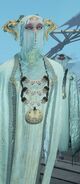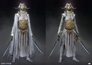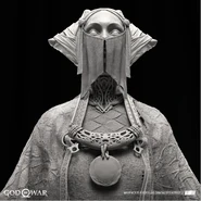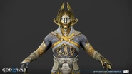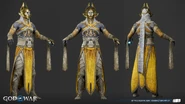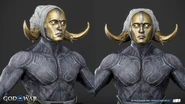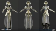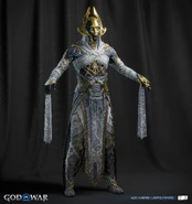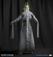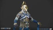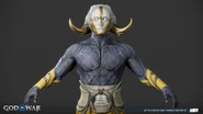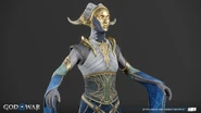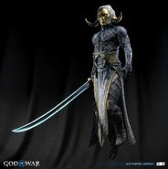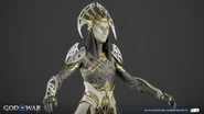 The light elves appear more diverse than when Kratos and Atreus first visited their realm. They all share the same features as a golden face mask that perfectly matches their true faces, down to their facial contouring and the characteristic scar-like lines all elves possess. Light elf soldiers are mostly female with curved, almost tusk-like horns (although, all the Light Elves' ears are actually concealed with their horns on both side) partially wrapped in white cloth. Minimal gold armor protects the torso, likely to allow maximum maneuverability in their weightless, dancing style of fighting. Beneath their mask, their skin is stony blue.