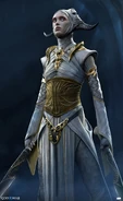The light elves are portrayed as beautiful and luminous beings, they have perfect skin of different colors, all light gray, marble white and pearly white. Most of them have bright eyes of pink, gray and light blue colors. The light elves have horns which they seem to have shaven down and decorated with white veils and have their typical pointed ears. The light elves wear fine fabrics of white and light blue colors and usually wear veils that cover their faces, whilst the warrior elves wear armor and masks imbued with light.