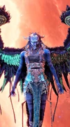Like all the other Valkyries, Mist is a very tall and slim woman whose most obvious characteristic remains her majestic Valkyrie wings, fashioned of a green metal. These wings are as sharp as razors and as sturdy as steel. While the primary goal of such attributes is indeed to allow Mist to fly as fast as possible, she does not hesitate to use them as weapons if necessary. Her face remains hidden and protected behind a masked helmet with downward-curving horns, likely designed with one purpose: to personify death. While it is true that all Valkyries wear a unique and intimidating helmet, Mist's particularly demonic mask is likely a testament to the darkness and evil that the Valkyries have succumbed to after serving the All-Father for centuries.