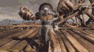 There are also flamethrowers in maps such as the Walls of Troy, the Labyrinth of Deadalus and the Bog of the Forgotten. They don't kill players instantly, but if they are hit by the fire, they'll be temporally burned, losing health, and will be disoriented. The Labyrinth also features big ventilators that can either blow warriors away or suck them with their strong winds, depending on what the user wants to do. If a warrior gets sucked by them, he'll die instantly when he touches it. The Bog of the Forgotten has also a statue of a serpent's head above one of its altars. When it's activated, it will open its mouth and "spit" a puddle of poison on the altar. At the Walls of Troy, spears come out of one of the walls and hot water vapor come out of another one at each second. These two traps cannot be controlled by any team and if they hit any player, he'll be seriously damaged.