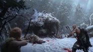 During Kratos' journey in the mountains when Kratos opened the gate with his son, a feral giant burst out the gate at them and warned them to turned back; instead Atreus stabs Ogre's eyes, causing it to cry painfully and began fighting two gods, eventually putting the ogre end by the hands of Kratos.