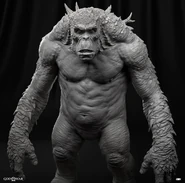 The Ogre looks like a giant, monstrous blend of gorilla, troll, and boar—a hulking brute with tusks, leathery skin, and crushing strength. The Ogre towers over Kratos but is shorter and more compact than Trolls. Its chest, shoulders, and arms are enormous, built for raw strength and crushing blows. It moves hunched forward with long, powerful arms, giving it an animalistic presence.