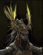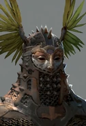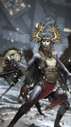 Like all Valkyries, Olrun's face is never shown and each Valkyrie would wear a very different type of helmet, the helmets would be themed together based upon a different creature. Olrun wears a golden helmet inspired by an Eagle, these masks are extenuate in all different directions, from various color choices to metalwork designs. The masks emitted regal beauty, while still being creepy in nature. Due to her corruption, her skin is an unhealthy pale blue. But one of the most striking elements of the Valkyries came in the design of their wings. Like the other Valkyries Olrun had extremely large mechanical wings, Olrun's wings were a golden yellow, they are covered in golden metal plates as armor thus why they are mechanical in the first place. Like her sisters, her design showed her both skilled and refined. With each Valkyrie, hints of their past would be shown off in their armor sets – not looking completely polished and showcasing a long-and-tired past, such as in the torn feather designs on the helmets.