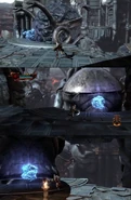 Onyx is encountered in God of War III, appearing as formations of slightly luminescent blue crystal. When it is first encountered, it is unbreakable by any of Kratos' weapons and tools; the Spartan could only shatter it by commandeering a Cyclops and letting him break it with its club, or by turning it to stone with the aid of a Gorgon. After taking the Nemean Cestus from his half-brother Hercules, Kratos finally gained the means to destroy Onyx. The Cestus was used to continuously pummel the Onyx Kratos encountered, causing the crystal to heat up. Its glow would slowly shift from blue to yellow to red, before the crystal shattered with a loud ringing.