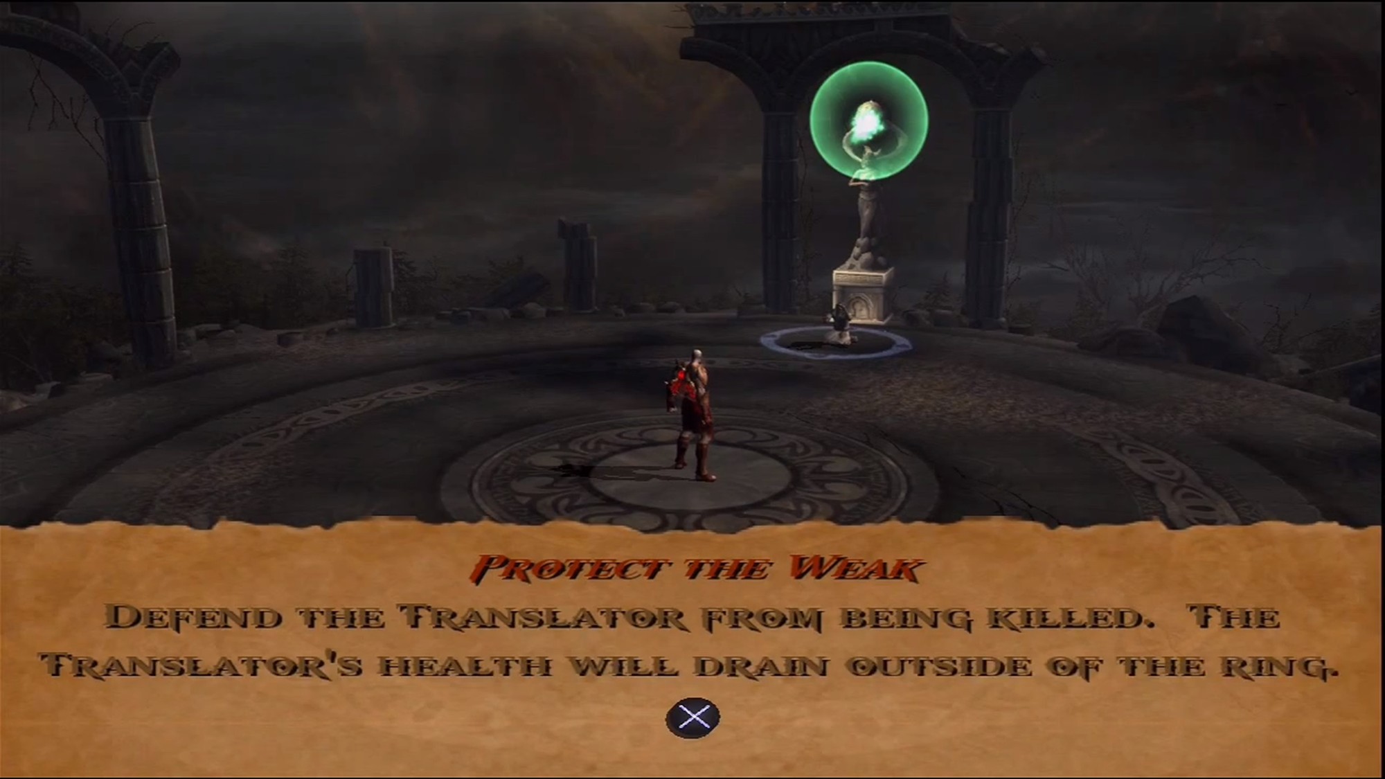 Kratos must prevent the Translator from getting killed before the time limit expires. All the while, enemies will continually attack Kratos and the Translator. In the Challenge, Kratos fights Sirens, Rabid Hounds, Satyrs and Cyclopes.