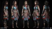 Freya's Regal Vanir Garments consist of a light blue dress with a red trim along the edges of the dress, and olive knee-length pants. Covering her dress are two metal shoulder-guards (one for each shoulder) and a leather waist-guard.