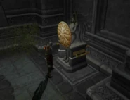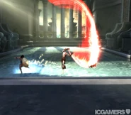 In God of War II, Perseus used the shield in his fight against Kratos, after Kratos had destroyed his helmet. With the shield, Perseus reflected the sun's rays, and momentarily blinded Kratos. The shield was also able to withstand some of Kratos' melee attacks, being Perseus' final defense in battle, after Kratos destroyed both his helmet and sword. However, the image of Medusa's face on it isn't able to petrify its owner's enemies in the God of War Universe. Also, while using the sword with the shield, Perseus had much more difficulty to block attacks with it, and when using only the shield in battle, the strikes blocked by it still pushed the warrior back (mostly because the floor of the battlefield is completely covered by water), and eventually Perseus was pushed against a wall, damaging and stunning him for a short while. After Kratos had killed Perseus, he took the shield, placing it on a statue to use it with the Golden Fleece to deflect the beams in the Courtyard of Atropos. The shield is left in the courtyard, placed on the mentioned statue, and isn't seen or used again in the game.