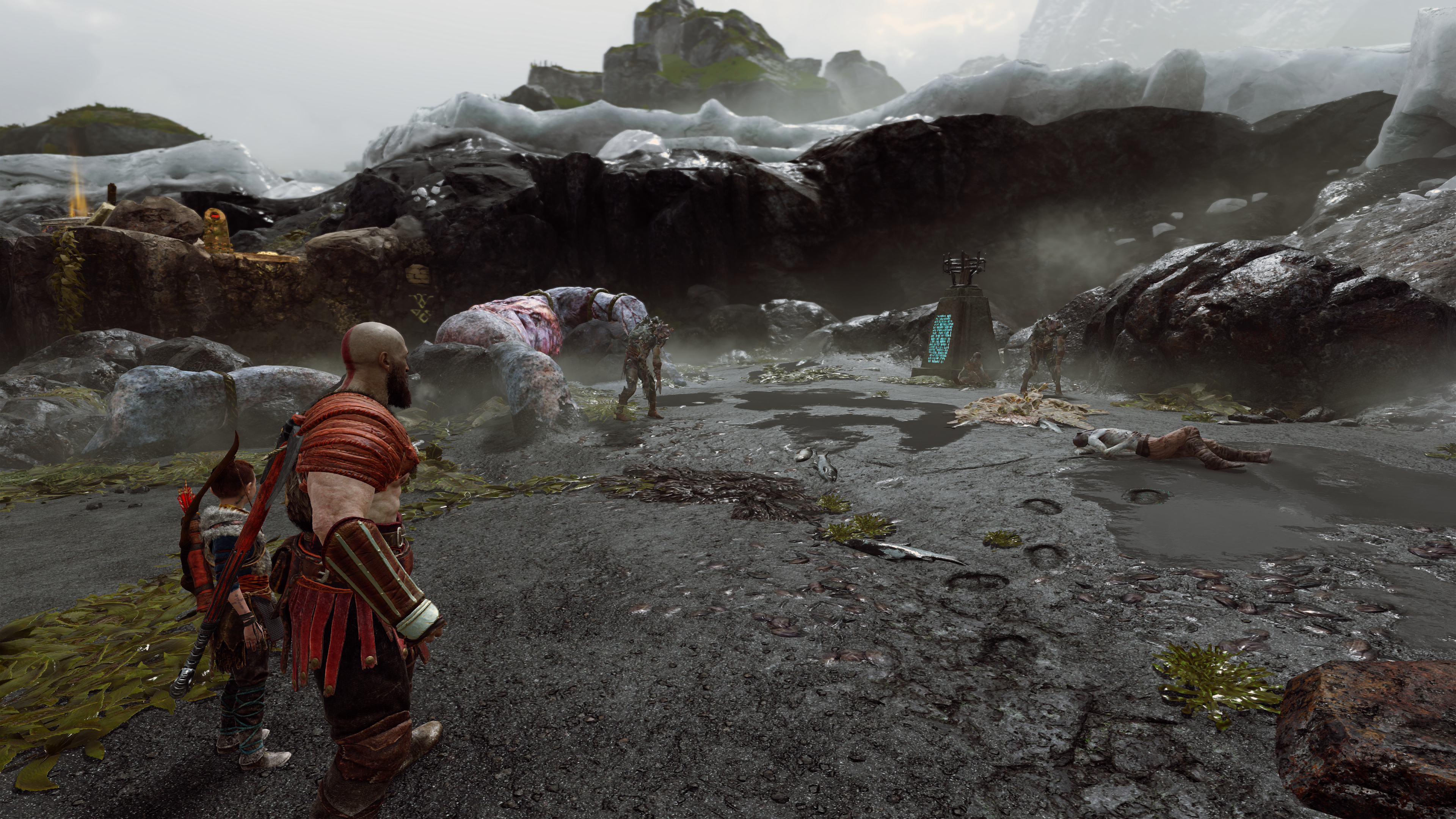 The fourth Lore Marker in the Shores of Nine is found in the Cliffs of the Raven area. This is the area with the ice chunks just East of the Vanaheim Tower that leads to the Foothills. Head to the back-most part of Cliffs of the Raven to find the large corpse of a troll, with the brazier close by. Have Atreus decipher the Runes to reveal Island Braziers if you haven't already - but beware an attack by Tatzelwurms and a Viken.