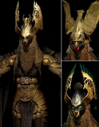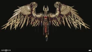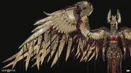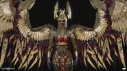 Like all Valkyries, Sigrún's face is never shown and each Valkyrie would wear a very different type of helmet, the helmets would be themed together based upon a different creature. Sigrún was intended to have a mythical edge to her design, this comes in to her golden helmet inspired by a Dragon, these masks are extenuate in all different directions, from various color choices to metalwork designs. The masks emitted regal beauty, while still being creepy in nature with Sigrún being built up to be the most ornate and mysterious of them all. Due to her corruption, her skin is an unhealthy pale blue. But one of the most striking elements of the Valkyries came in the design of their wings. Like the other Valkyries, Sigrún had extremely large mechanical wings, were blood red, and are covered in golden metal plates as armor thus why they are mechanical in the first place. Like her sisters, her design showed her both skilled and refined. With each Valkyrie, hints of their past would be shown off in their armor sets – not looking completely polished and showcasing a long-and-tired past, such as in the torn feather designs on the helmets.