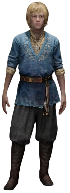 Skjöldr is a thin boy of average height, believed to be about the same age as Atreus, Thrúd and Angrboda, with pale and somewhat dirty skin, freckles, blonde hair and brown eyes. He wears a slightly torn and tattered light blue, embroidered tunic with yellow cuffs over a yellow shirt, the embroidery is yellow on the blue tunic while a similar pattern can be seen on the yellow shirt in a darker yellow. The tunic is tightened at the waist with a brown leather belt, the belt has a golden buckle with an intricate design, hanging from the buckle are five golden threads with five small golden objects hanging from them. He also wears grey puffy pants and long brown leather boots with simple stitching. He also wears a necklace with a silver symbol around his neck.