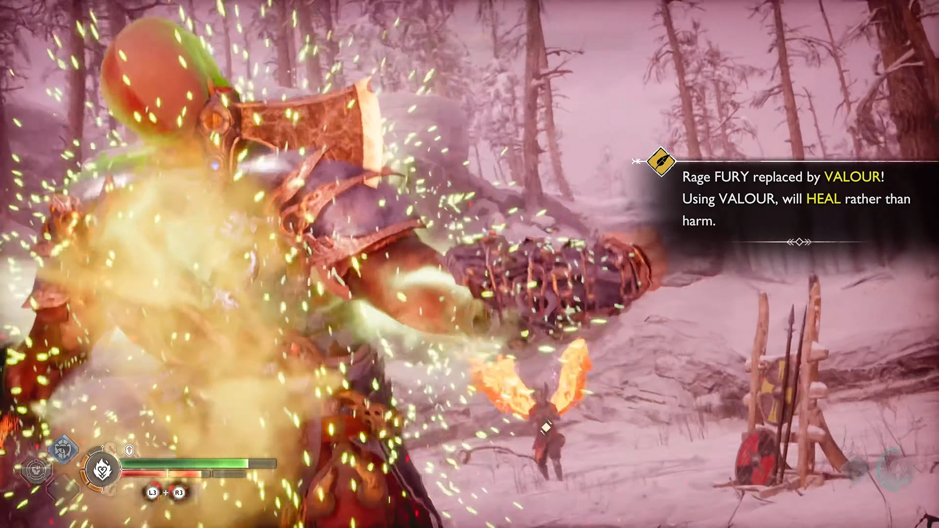 Valour is unlocked during the second confrontation with Freya, after Atreus returns from Jotunheim. Valor allows Kratos to instantly expend some Rage in exchange for health. Using Valour just before getting hit with an attack increases the health restoration and grants a buff to melee damage for a time.