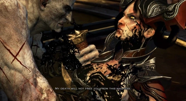 After he kills the Furies, Kratos meets with Orkos, who reveals that the Furies made Orkos the oath-keeper of Kratos once more just before their deaths. Orkos adds that in order for Kratos to finally be free, he must kill Orkos. Kratos refuses initially and states that he will not shed more innocent blood, but Orkos begs the Spartan and asks him to give him an honorable death. Kratos eventually complies and reluctantly stabs Orkos.