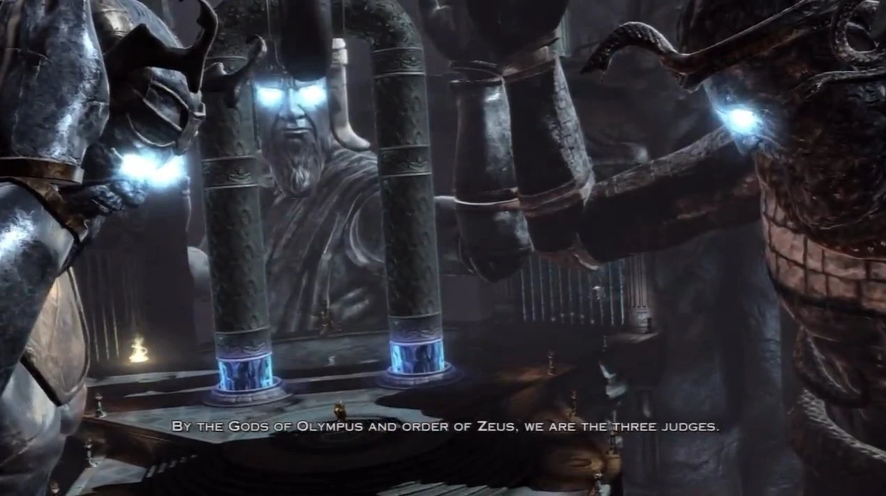 Kratos encounters the statues of the Three Judges in the Underworld who judge him after Kratos completes the Trials of Erebus. King Minos deems that Kratos still has time left in the mortal world, and grants him access to a Hyperion Gate so that he may proceed on. Later on, the Judges grab the Chain of Balance, preventing Kratos from accessing the The Flames of Olympus. After rescuing Pandora from the Labyrinth, Kratos returns to the Underworld and smashes the Onyx on the back of their heads with the Nemean Cestus, killing them and releasing the Chain.