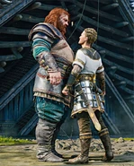 Sent to find Thor for another mission, Atreus goes to Thrúd for help and they both find Thor in a tavern- the Black Thunder - drinking and reverting to his bad habits. When they find him at a table with several Einherjar, the God of Thunder was so drunk that he didn't immediately notice their presence, and he barely listened to Loki when the latter tried to get him out of there. But Thrúd knew better how to handle her father, and as soon as she showed up next to him, Thor finally paid attention. Reacting with disbelief at her presence in the Mead Hall but unable to scold her, he instead turned his attention to Atreus and berated him for having brought his daughter to such a disreputable place. Nevertheless, Thor felt genuinely ashamed since he had promised his daughter that he would stop drinking, and as a result, he consciously avoided her furious gaze.