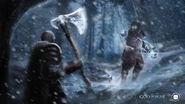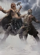 Thor was this time facing a more wary and better prepared opponent. Blaming Kratos for having brought the war to Asgard and for the destruction of his family, Thor unleashed the full weight of his powers but proved unable to break through the Spartan's discipline, who ultimately overpowered the might of Mjölnir with the resilience of the Leviathan Axe.