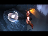 Upon trapping the Pegasus, Typhon declares that Kratos wont get any help from, being an Olympian. The Spartan looked at the vast, frozen Titan, contemplating his predicament, before continuing to explore the icy mountain cavern. He discovered that the Sentries who live within this place, regularly keep heating and warming the Titan, to keep him from freezing over completely. Kratos came upon Prometheus, who told him that in order to free him he would need Typhon's Bane, the magical bow within his left eye. The Spartan returned inside the mountain and approached Typhon, wondering how he could retrieve the Bow, when Typhon's voice resonated within the cavern, telling the White Warrior that he cannot win and should surrender, promising a quick death.