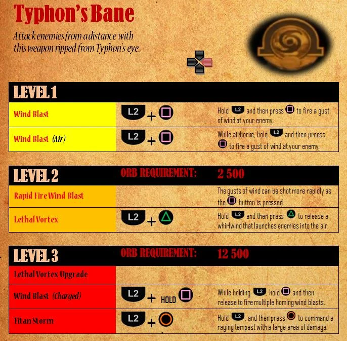 - Before God of War II's release, it was an Unnamed Wind Magic that was in place of Typhon's Bane.