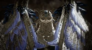 Olrun, the Valkyrie Historian is located in Alfheim, within a Hidden Chamber of Odin on the Light Elf Shore. She is one of the quicker Valkyries and has many unblockable moves that can do devastating damage. She attacks solely with her wings, utilizing her feathers to launch projectile, and often dashes into melee range to spin-attack or attack normally. She can also utilize the jump-stomp used by several other valkyries.