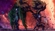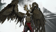 As a boss, Gná shows a wide variety of attacks that can severely damage the player if they aren't cautious, like long-ranged wing feathers imbued with Bifröst energy, sweeping attacks using an atgeir (which replaces the scythe used by original nine Valkyries), Bifröst projectiles which she can summon from the sky, close-ranged attacks using a pair of shuriken-like glaives similar to Mist's and even a massive shockwave of electricity.